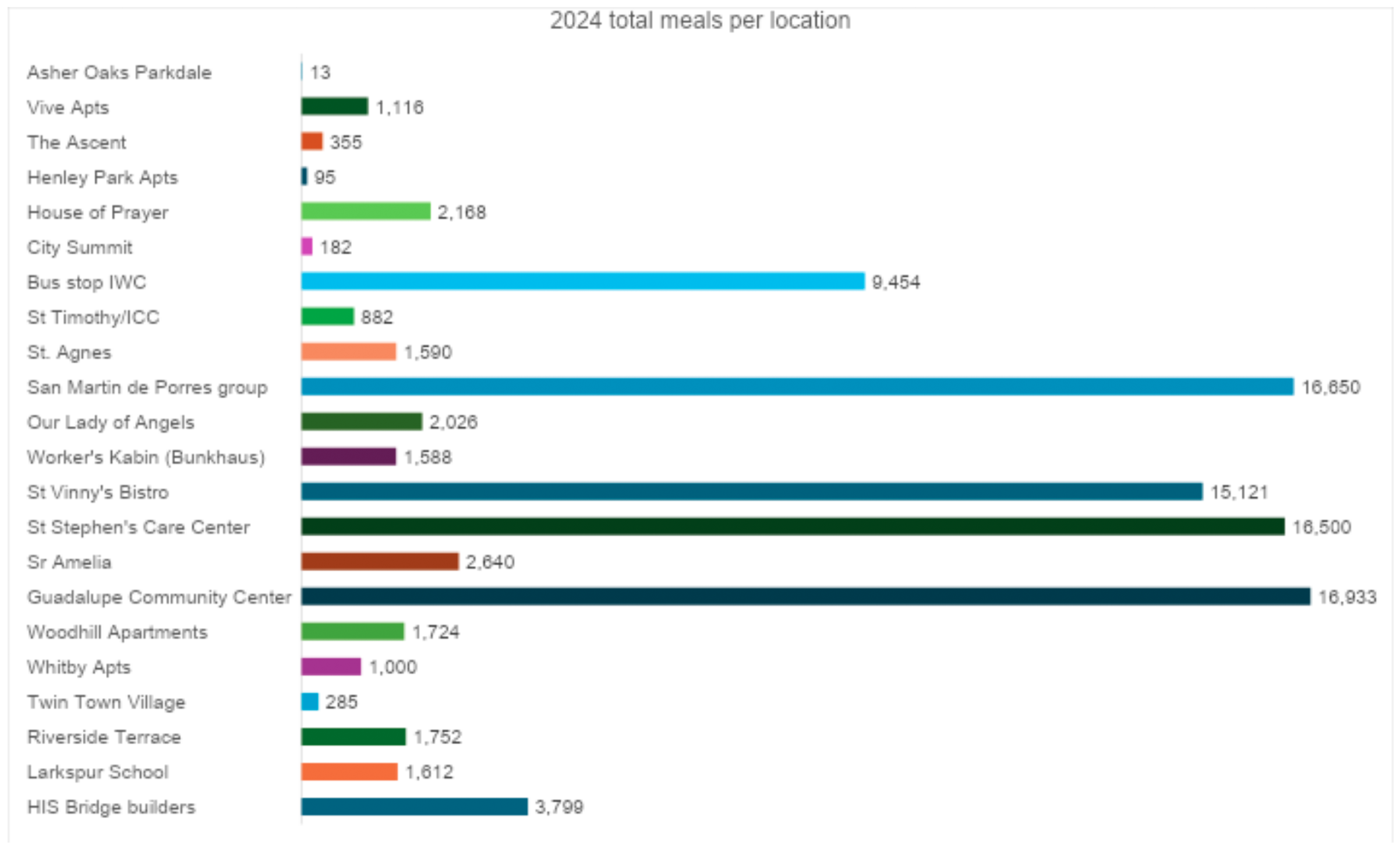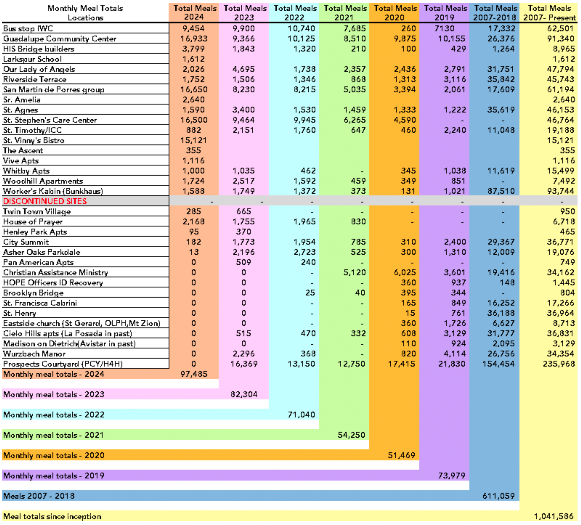 In September 2016, our Mobile Loaves & Fishes program completed the organizational transition of changing its parent sponsor from MLF Austin to St. Francis of Assisi Catholic Church. In effect, MLF has become a ministry under the umbrella of our existing parish. The dedication, hard work, and tireless efforts of the St. Francis of Assisi and other area MLF volunteers have enabled our ministry to serve a total of 1,000,000+ meals from 2007 through December 2024.